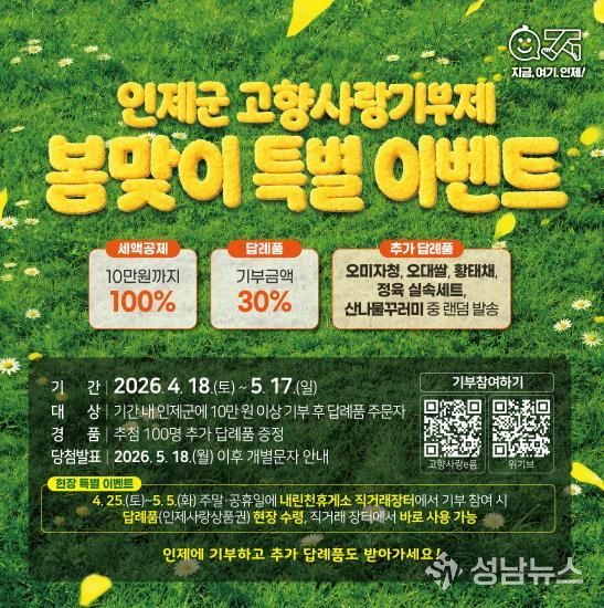 김장웅 인제군 지역발전과장은 “봄철 인제군을 찾는 방문객들에게 고향사랑기부제를 자연스럽게 알리고 참여를 독려하기 위해 이번 이벤트를 마련했다”며, “고향을 사랑하는 마음으로 기부하고 세액공제와 답례품 혜택은 물론, 지역 농특산물 소비 활성화에도 동참하는 뜻깊은 기회가 되길 바란다”고 말했다.