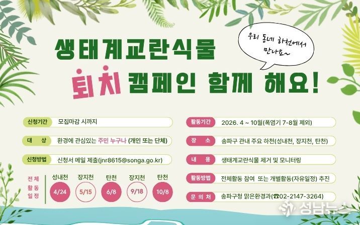 송파구는 4월 24일부터 10월까지 성내천·장지천·탄천 일대에서 ‘생태계교란식물 퇴치 캠페인’을 진행한다. 이번 활동은 지구의 날을 기점으로 송파구시설관리공단과 환경단체, 주민이 함께하는 민관 협력 방식으로 운영된다.