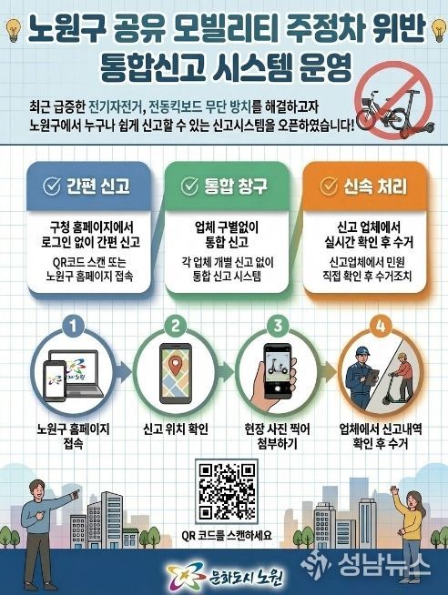 오승록 노원구청장은 “이번 통합 신고시스템 구축은 무단 방치된 공유 모빌리티로 인한 주민 불편을 최소화하기 위한 선제적 조치”라며, “앞으로도 쾌적한 도시 미관을 조성하고, 구민 누구나 안심하고 걸을 수 있는 안전한 보행환경을 만드는 데 최선을 다하겠다”라고 말했다.