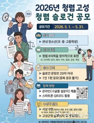 고성군은 관내 초·중·고등학생을 대상으로 「2026년 고성군 청렴 슬로건 공모전」을 오는 5월 말까지 실시한다.
