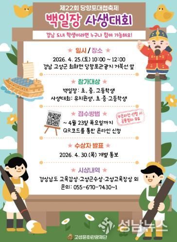 고성문화관광재단은 '제22회 당항포대첩축제' 기간 중 청소년과 가족이 함께 참여할 수 있는 체험형 역사교육 프로그램으로, 4월 25일 오전 10시 ‘경남학생 백일장·사생대회’와 오후 1시 ‘최태성과 함께하는 당항포대첩 – 두 번째 이야기’를 운영한다.