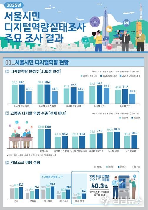‘서울시민 디지털역량실태조사’는 시민의 디지털 활용 수준과 인식, 디지털 격차 등을 종합적으로 파악하기 위해 2021년부터 격년으로 실시되고 있으며, 2025년에는 19세 이상 서울시민 5,500명(55세 이상 고령층 2,500명 포함) 대상의 가구 방문 면접조사 방식으로 진행됐다.