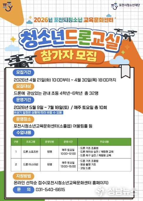 (재)포천시청소년재단 포천시청소년교육문화센터는 오는 4월 21일부터 30일까지 관내 초등학교 4학년부터 6학년을 대상으로 청소년드론교실 1기 참가자를 선착순으로 모집한다고 밝혔다.