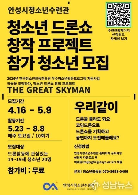 안성시청소년수련관은 미래 디지털 인재 양성을 위한 청소년 참여형 프로그램 '하늘을 코딩하다, 청소년 드론쇼 창작 프로젝트 ‘THE GREAT SKYMAN’'에 참여할 청소년을 4월 16일 ~ 5월 8일까지 모집한다고 밝혔다.