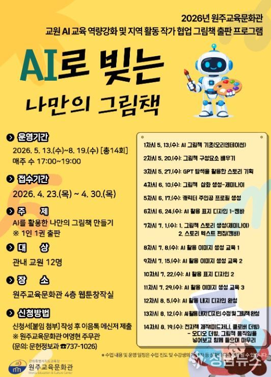 원주교육문화관은 교원의 미래 교육 역량 강화를 지원하기 위한 인공지능(AI) 활용 그림책 출판 프로그램 ‘AI로 빚는 나만의 그림책’을 오는 5월 13일부터 8월 19일까지 총 14회에 걸쳐 운영할 예정이다.