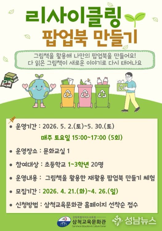 장병진 삼척교육문화관장은 “기존 그림책을 재활용해 팝업북으로 다시 구성하는 활동을 통해 어린이들이 책을 새롭게 바라보고 창의적으로 표현하는 즐거움을 느끼는 한편, 자원 순환의 가치도 자연스럽게 체득하길 바란다”라고 말했다.