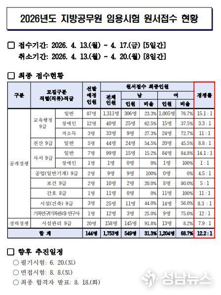 부산광역시교육청은 지난 13일부터 17일까지 실시한 ‘2026년도 지방공무원 임용시험’ 원서접수 결과 144명 선발에 1,753명이 지원해 평균 12.2대 1의 경쟁률을 보였다고 밝혔다.