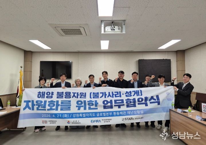 강원특별자치도 제2청사(본부장 손창환)는 4월 21일 강원특별자치도청 제2청사 환동해관에서 강릉시, 한국수산자원공단, ㈜스타스테크와 함께 ‘해양 불용자원 자원화’를 위한 업무협약을 체결했다고 밝혔다.