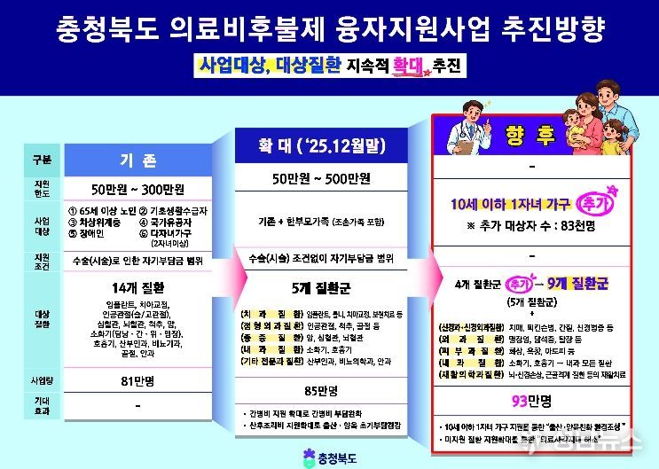 충청북도는 여기에서 더 나아가 지원 대상을 10세 이하 자녀를 둔 한 자녀 가정까지 확대하고, 신경과·외과·피부과·재활의학과 등 4개 질환군을 추가해 기존 5개 질환군에서 총 9개 질환군으로 확대할 계획이다. 이를 통해 보다 촘촘하고 빈틈없는 지원체계를 구축한다는 방침이다.