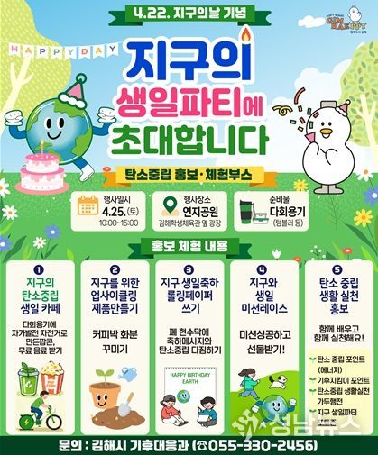 김해시는 지구의 날(4.22)을 기념한 제18회 기후변화주간을 맞아 오는 25일 오전 10시부터 오후 3시까지 연지공원에서 탄소중립 체험 행사‘지구의 생일파티에 초대합니다’를 운영한다고 22일 밝혔다.