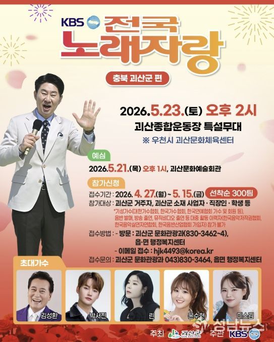 송인헌 군수는 “전국노래자랑 괴산군편은 군민이 직접 참여하고 함께 즐기는 대표적인 문화행사로 많은 주민들이 예심에 도전해 끼와 재능을 마음껏 발휘하길 바란다”며 “행사 당일에도 많은 방문객들이 함께해 괴산의 활기찬 분위기를 느끼는 계기가 되길 기대한다”고 말했다.