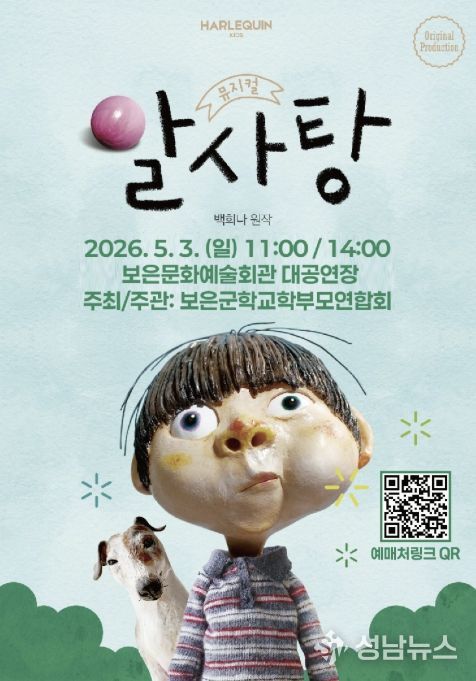 어린이주간 기념 가족 뮤지컬 ‘알사탕’ 공연은 5월 3일 오전 11시와 오후 2시 보은문화예술회관에서 열린다. 백희나 작가의 동명 그림책을 원작으로 한 따뜻한 성장 이야기를 담았다. 관람은 무료이며 티켓링크를 통한 사전 예매로 진행된다.