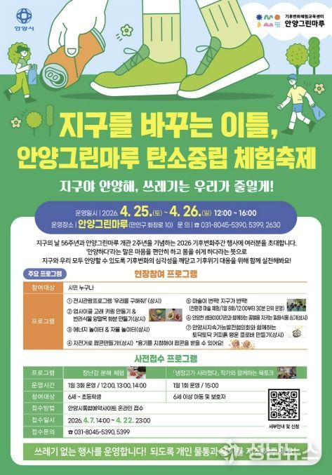 이와 함께 이달 25일부터 26일까지 안양그린마루(만안구 화창로 10)에서 ‘지구를 바꾸는 이틀, 안양그린마루 탄소중립 체험 축제’가 열린다.