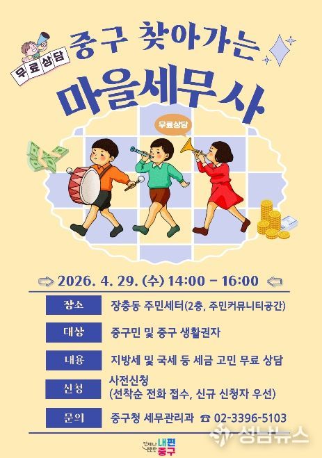 서울 중구는 구민들이 일상에서 겪는 세금 고민을 보다 쉽고 편하게 해결할 수 있도록 오는 29일 오후 2시 장충동 주민센터 2층에서 '찾아가는 마을세무사'를 운영한다.