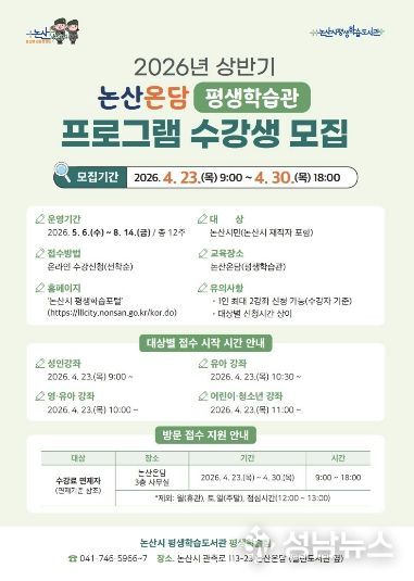논산시가 4월 23일부터 4월 30일까지 ‘2026년 논산시평생학습도서관 상반기 정규 프로그램’수강생을 모집한다.