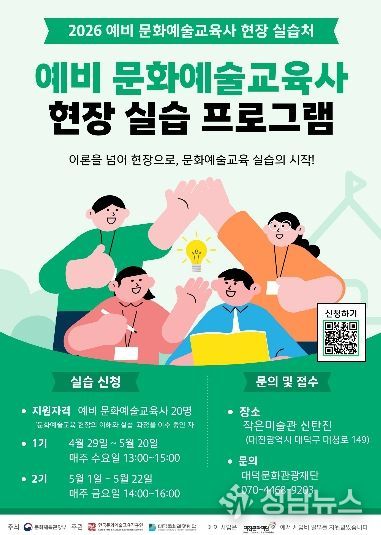 신청은 4월 28일까지 가능하며, 문화예술교육사 2급 자격과정 이수자 또는 ‘문화예술교육 현장의 이해와 실습’ 교과목 수강자를 대상으로 한다. 접수는 포스터 내 QR코드를 통해 네이버폼으로 진행된다.