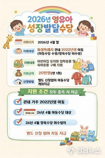 화성특례시는 어린이집 및 유치원 입학 초기 영유아 가정의 양육 부담을 덜고 아동의 건강한 성장을 지원하기 위해 ‘2026년 영유아 성장발달수당’을 지급한다고 밝혔다.