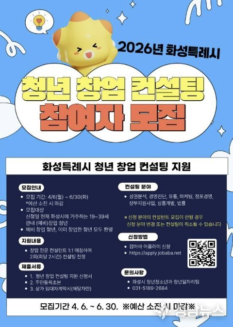 화성특례시는 오는 6월 30일까지 ‘2026년 청년 창업 컨설팅 지원사업’ 참여자를 모집한다.