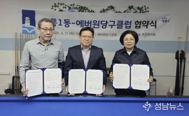 수원시 영통구 영통1동 행정복지센터와 영통1동 주민자치회는 지난 21일, 주민자치센터 프로그램의 다양성과 전문성을 강화하기 위해 관내 민간체육시설인 에버원당구클럽과 업무협약을 체결했다.