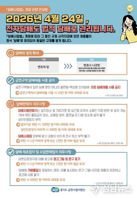 이번 점검은 2026년 4월 24일부터 시행되는 '담배사업법' 개정에 따른 조치로, 액상형 전자담배 등 신종 담배 제품이 처음으로 본격적인 법적 관리 대상에 포함되면서 점검 범위가 크게 확대됐다.