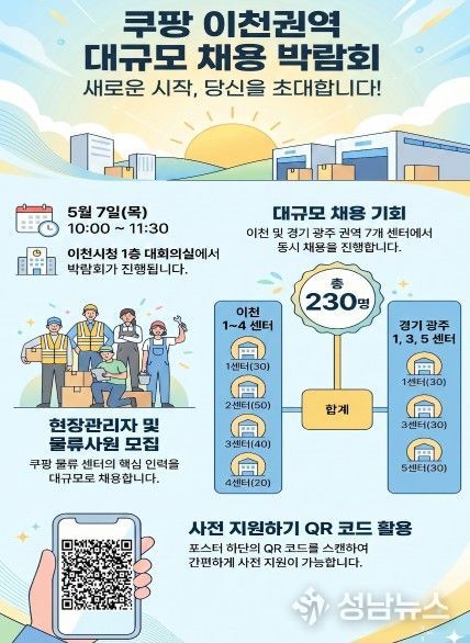 이천시는 오는 5월 7일 오전 10시부터 11시 30분까지 이천시청 1층 대회의실에서 ‘쿠팡 이천권역 대규모 채용 박람회’를 개최한다.