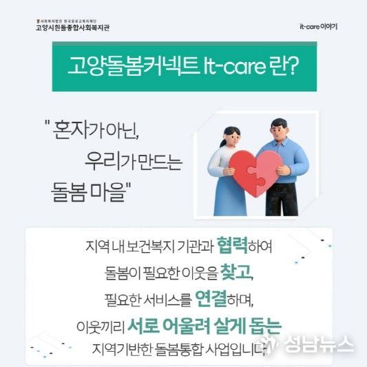 고양돌봄커넥트 It-care 사업은 복합적인 위기에 처한 주민들이 지역사회 안에서 건강하고 독립적인 생활을 유지할 수 있도록 보건과 복지 서비스를 하나로 잇는 통합돌봄 체계를 구축하는 사업이다.