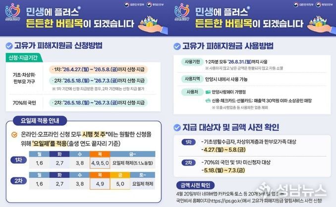 고유가 피해지원금은 소득 하위 70%의 시민을 대상으로 1인당 10만원이 지급되며, 기초생활 수급자는 55만원・차상위계층 및 한부모가족 대상자에는 45만원이 지급된다.