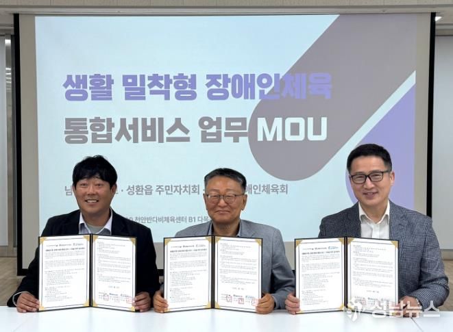 천안시장애인체육회는 22일 천안반다비체육센터에서 성환읍 주민자치회, 남서울대학교와 ‘생활밀착형 장애인체육 통합서비스 구축을 위한 업무협약’을 체결했다.