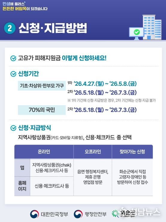 지급 방식은 신용·체크카드 또는 화순사랑상품권(지류·모바일) 중 선택할 수 있으며, 군은 신속한 지급과 이용 편의를 위해 카드 및 모바일 신청을 권장하고 있다.