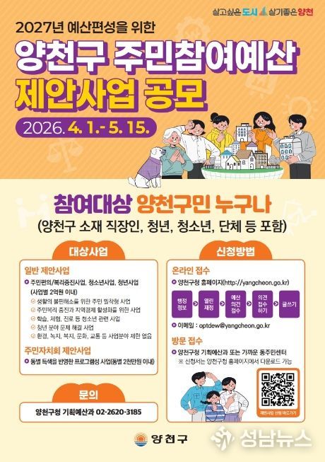 양천구는 2027년 예산 편성 과정에 구민의 목소리를 반영하기 위해 ‘주민참여예산 제안사업’ 공모를 오는 5월 15일까지 진행한다고 밝혔다.