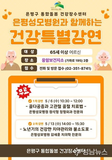 서울 은평구는 다음 달 6일과 13일 구민의 건강한 노후생활을 지원하기 위해 65세 이상 어르신을 대상으로 ‘건강특별강연’을 운영한다고 밝혔다.