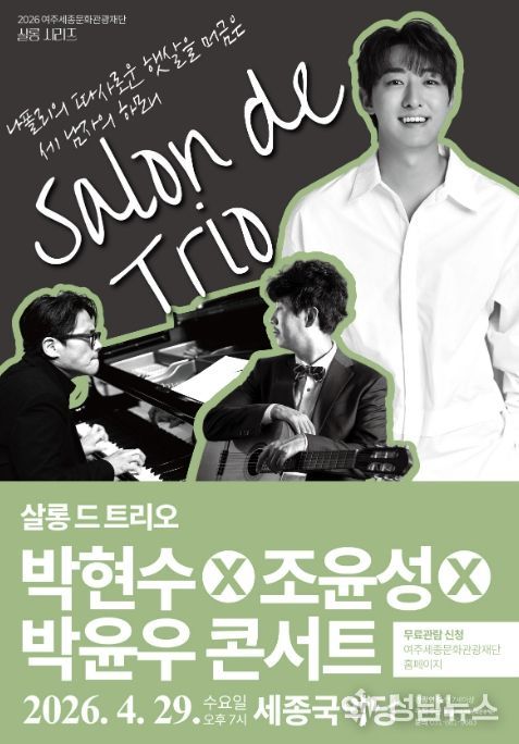 여주세종문화관광재단이 오는 29일, 문화가 있는 날을 맞아 2026년 특별기획 살롱 시리즈의 세 번째 무대 '살롱 드 트리오 박현수X조윤성X박윤우 콘서트'를 세종국악당에서 개최한다.
