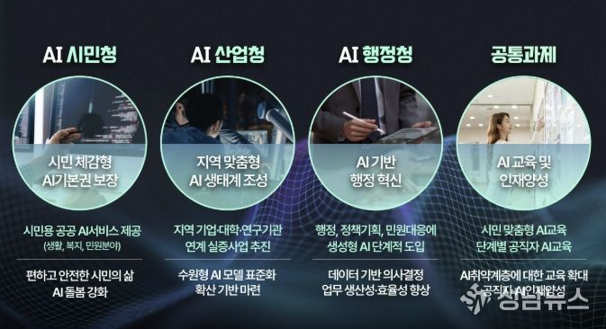 ‘시민 모두의 인공지능 기본권 실현’, ‘인공지능 산업생태계 조성’, ‘인공지능 기반 행정 혁신’을 3대 목표로 설정하고, ▲인공지능(AI) 시민청 ▲인공지능(AI) 산업청 ▲인공지능(AI) 행정청 ▲인공지능 교육·인재 양성으로 분야를 나눠 인공지능 기반 사업을 추진한다.