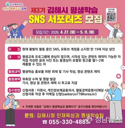 김해시는 27일부터 5월 11일까지 제3기 김해시 평생학습 SNS 서포터즈를 모집한다.