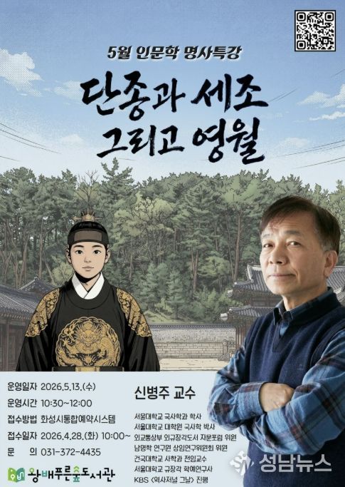 화성시문화관광재단 운영하는 왕배푸른숲도서관이 오는 5월 13일, 지역 주민들을 위해 역사학자 신병주 교수를 초청하여 5월 인문학 명사특강을 개최한다.