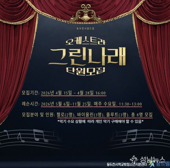 동두천시학교밖청소년지원센터는 2026년을 맞아 학교 밖 청소년을 대상으로 ‘그린나래 오케스트라’ 신규 단원을 모집한다고 밝혔다.