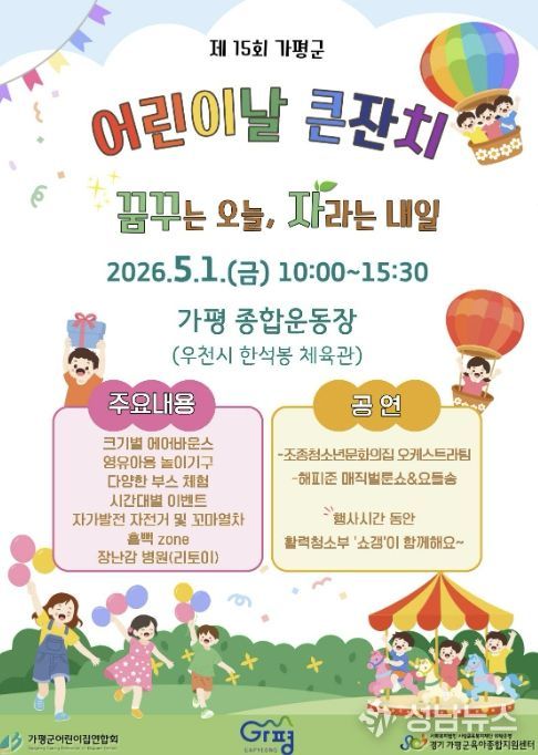 가평군은 오는 5월 1일 오전 10시 가평종합운동장에서 ‘제15회 가평군 어린이날 기념행사’를 개최한다. 가평군어린이집연합회와 가평군육아종합지원센터가 공동 주관하는 이번 축제는 기념행사와 공연, 놀이, 체험 부스 등 다채로운 프로그램으로 꾸며진다.