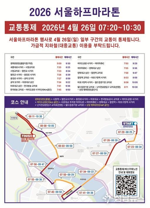 서울시는 4월 26일 오전 7시 30분 광화문광장을 출발해 여의도공원과 상암 월드컵공원으로 이어지는 ‘2026 서울하프마라톤대회’를 개최한다.