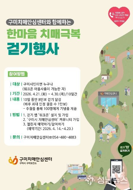 구미시는 치매 예방과 시민 건강 증진을 위해‘2026년 한마음 치매극복 걷기 챌린지’를 운영한다. 이번 챌린지는 시민 누구나 참여할 수 있는 비대면 걷기 프로그램으로 진행된다.