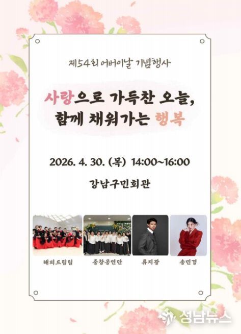 꿈이 모이는 도시, 미래를 그리는 강남구가 제54회 어버이날을 맞아 4월 30일 오후 2시부터 4시까지 강남구민회관에서 기념행사를 개최하고, 5월 8일에는 7개 노인복지관에서 다채로운 행사를 이어간다.
