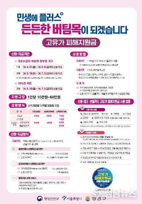 양천구가 중동 전쟁에 따른 고유가·고물가로 어려움을 겪는 구민의 경제적 부담을 완화하기 위해 ‘고유가 피해지원금’ 전담 추진단을 구성하고 27일부터 지급 절차를 시작한다고 밝혔다.