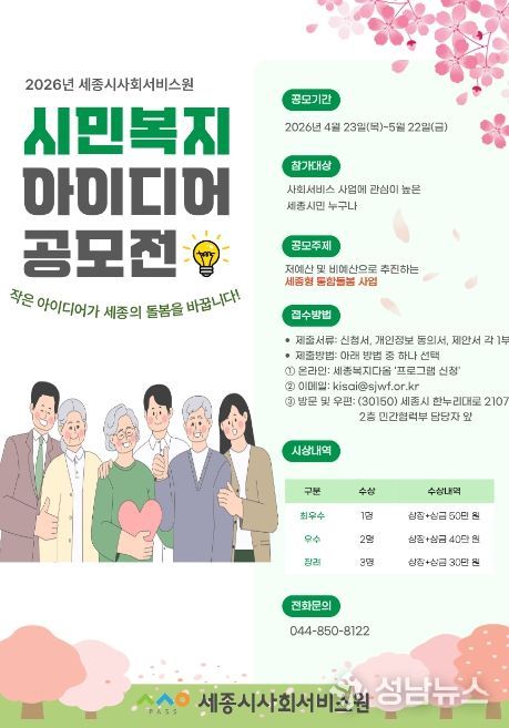 세종시사회서비스원은 시민의 일상 속 경험과 참신한 제안을 바탕으로 지역 복지 문제를 함께 해결하기 위해 ‘2026년 시민복지 아이디어 공모전’을 개최한다고 밝혔다.