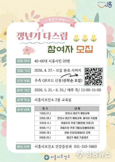 시흥시보건소는 올해부터 한의약 건강증진사업을 시범으로 운영하고, 40~60대 시흥시민을 대상으로 갱년기 신체ㆍ정신 건강관리를 지원하는 한의약 건강증진 프로그램 ‘갱년기 다스림’ 참여자를 모집한다.