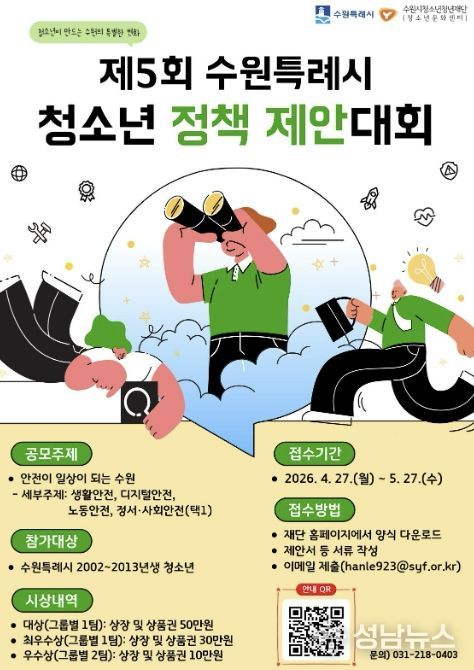수원시청소년청년재단 수원청소년문화센터는 청소년이 정책을 기획하고 제안하는 ‘제5회 수원특례시 청소년 정책 제안대회’ 참가팀을 4월 27일부터 5월 27일까지 모집한다.