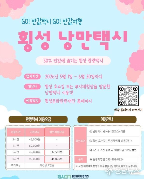 횡성군과 횡성문화관광재단이 운영하는 횡성 낭만택시가 오는 5월 1일부터 6월 30일까지 이용요금 50% 할인 행사를 실시한다고 밝혔다.
