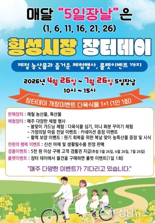 횡성군이 전통시장 내 고객 유입을 촉진하고 지역 경제에 활력을 불어넣기 위해 오는 4월 26일부터 7월 26일까지 ‘2026 횡성전통시장 장터데이’ 행사를 개최한다.