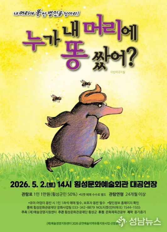 횡성문화관광재단은 5월 가정의 달을 맞아 오는 5월 2일 토요일 오후 2시, 인기 그림책을 원작으로 한 어린이뮤지컬 '누가 내 머리에 똥 쌌어' 를 선보인다.