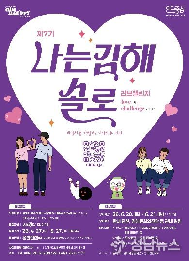 김해시는 오는 6월 20일부터 21일까지 1박 2일 일정으로 관내 펜션과 김해문화의전당 등에서 진행하는‘제7기 나는 김해솔로-러브챌린지’참가자 24명(남·여 각 12명)을 모집한다고 24일 밝혔다.