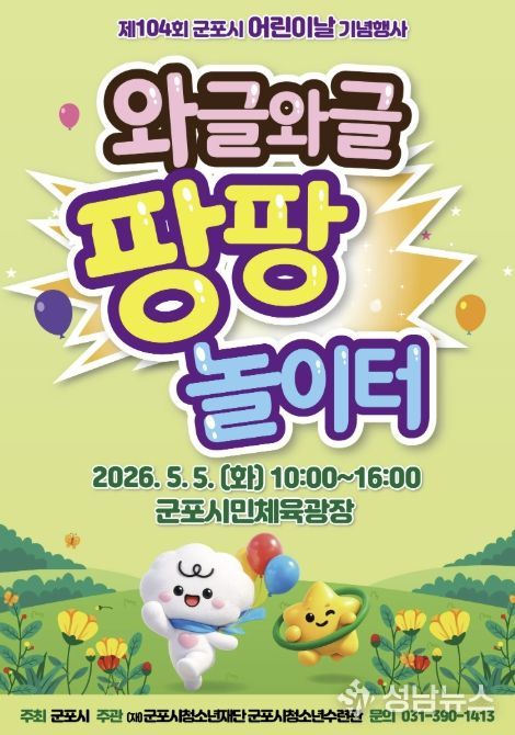 군포시는 제104회 어린이날을 맞아 오는 5월 5일 오전 10시부터 오후 4시까지 군포시민체육광장에서 ‘와글와글 팡팡 놀이터’를 주제로 어린이날 기념행사를 개최한다.
