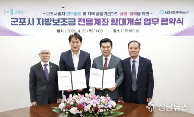 군포시는 지방보조금 전용계좌 개설 금융기관을 기존 시 금고인 NH농협은행에 더해 새마을금고까지 확대하기 위한 업무협약을 23일 체결했다고 밝혔다.